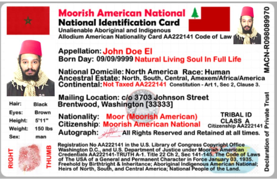 Moorish American Nationality Card Identification, and Zodiac Constitution in the United States Library of Congress Copyright Office Washington D.C., and The United States Department of Justice, under Moorish American Credentials AA222141- TRUTH A-1., Washington D.C., United States of America.