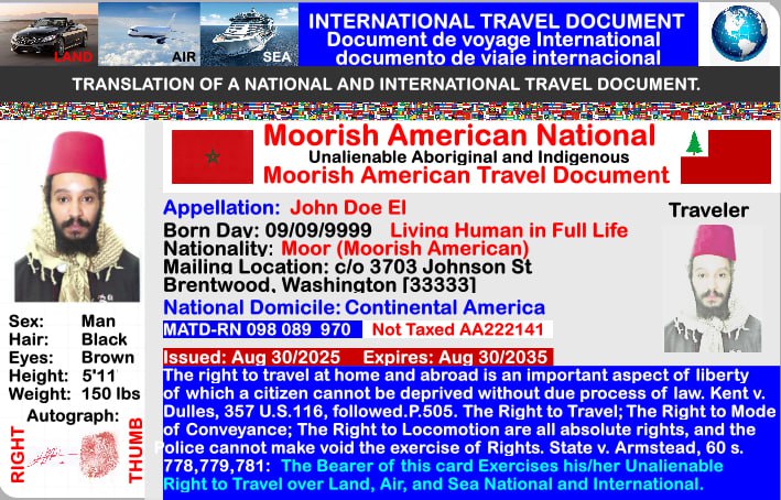 We are Fundamentally Els and Beys. You can also use one or more titles in your name. For Example, John El, John Bey or John El Bey. The other titles are to be attained by degree. These titles are of OUR foremothers and forefathers. They are DIVINE in nature and in Spirit. In addition to the National ID, we offer the Travel Card. In fact, and in Law, if you do not have the ‘preferred’ ID of the asker, you can present 2 of another ID, which is sufficient. Many of the rules and thoughts people utilize in regards to ID’s is based on the fact that they do not have a National ID’s. In the absence of a National ID, they commonly have accepted a Birth Certificate, Drivers License. and others. Which are not real Identification and CANNOT Identify a breathing living soul. Those instruments are commonly accepted BECAUSE one does not have a National ID Card. And a CORPORATE STATE / CORPORATION (Municipality) CANNOT offer National Identification Cards. Know that a National Identification Card is supreme to all Corporate Federal Identification.