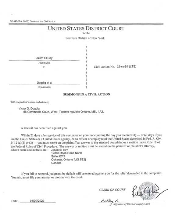 Summons in a Civil Action, Jakim v. Victor G. Dogdig, CO of CIBC BANK, et al.